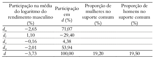 Dentro do suporte comum, as características observáveis (dx) pouco explicam a vantagem salarial masculina. Assim, a parcela do diferencial salarial que na decomposição de Blinder-Oaxaca era atribuída a diferenças nas características observáveis de homens e mulheres (45%), na realidade, baseava-se em uma comparação entre indivíduos não equivalentes. Quando a comparação passa a considerar apenas os indivíduos da amostra que integram o suporte comum de características observáveis, essa parcela tem sua participação reduzida para 4,38% do diferencial salarial.
