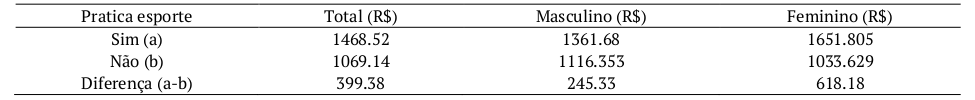 Os esquemas de percepção e apropriação antagônicos que constitui os agentes sociais conformaram a lógica do campo esportivo e, como observado, orientaram as tomadas de posição (escolha por determinada prática) de acordo com as diferenças de gênero. No entanto, vale destacar que a escolha por um esporte perpassa por outras dicotomias como a classe social (posição) que determinada mulher se encontra na sociedade. Os dados da Pnad demonstram que a prática de esportes está concentrada especialmente entre as pessoas que possuem maior renda, com uma dicotomia maior entre as mulheres (Tabela 1).
