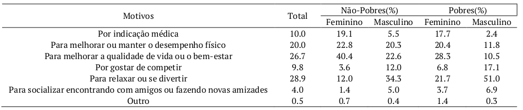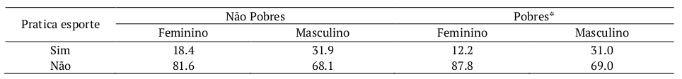 A prática esportiva das mulheres brasileiras, independente das condições econômicas, está voltada especialmente para a melhoria da qualidade de vida ou pela busca do bem-estar. Destarte, para 44.4% das mulheres ‘não pobres’ e para 28,3% das inseridas na condição de pobreza, este seria o principal motivo para se praticar esportes (Tabela 4).