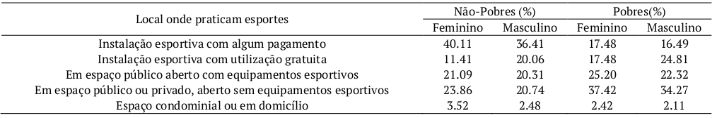 A prática esportiva das mulheres mais pobres ocorre geralmente em instalações gratuitas ou em espaços públicos ou privados sem equipamentos esportivos, diferentemente das mulheres não pobres, as quais boa parte efetuam o pagamento de instalações e utilizam equipamentos esportivos (Tabela 3). De forma mais precisa, 81% das mulheres que estão na condição de pobreza utilizam espaço público para suas práticas esportivas, enquanto que dentre as não pobres esse percentual é de apenas 56%. Portanto, a existência de espaços públicos gratuitos ao longo do país se apresenta essencial para que as mulheres mais vulneráveis economicamente tenham a oportunidade de se inserir nas atividades esportivas. Esses dados ratificam as argumentações de Matinez et al (2011) sobre a disponibilidade de recursos de quem tem maior renda, possibilitando o acesso aos locais apropriados para a prática esportiva, tendo, em geral, supervisão de um profissional.
