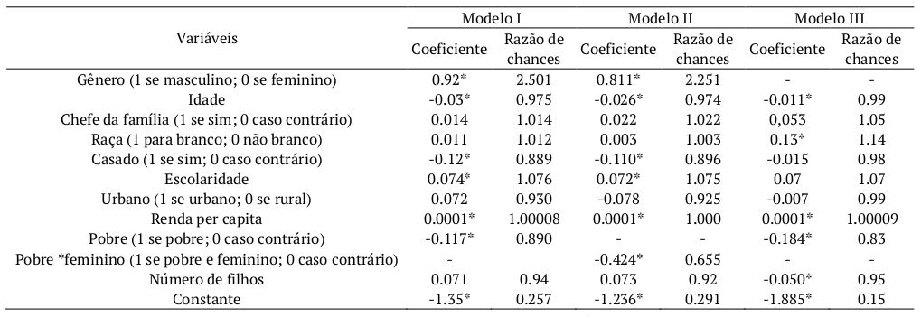 É importante destacar que na análise das estimativas se focou nos resultados de gênero e de condição de pobreza, apresentando os demais coeficientes, mas focando apenas nesses dois argumentos, que é o ponto principal desse artigo[4].