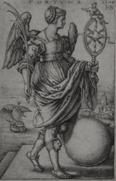 Justamente en función de tal inseguridad, característica de la Fortuna, se suelen poner una mujer con una vela o con una rueda en las manos, pero siempre buscando el equilibrio sobre una esfera.