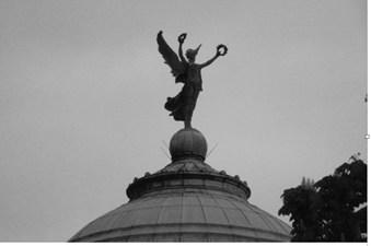 De ese modo, la forma en la cual algunas de esas victorias son recordadas es por medio del ángel de la victoria (Figura 2), por encima de la esfera (que representa la Fortuna), o por encima de un cuadrado (exhibiendo su estabilidad), como en el caso ángel de la victoria protegiendo con sus alas a los soldados belgas (Figura 10). En este caso, la estructura de la base donde está el ángel es cuadrada y robusta. Hay también otros ejemplos, como en una de las avenidas centrales de Bruselas, donde la estatua del ángel de la victoria (Figura 11) comparte la corona de la victoria.