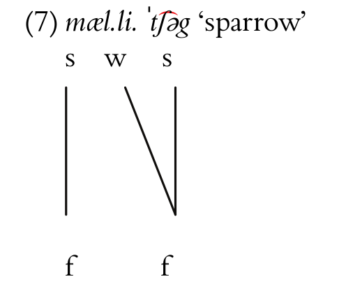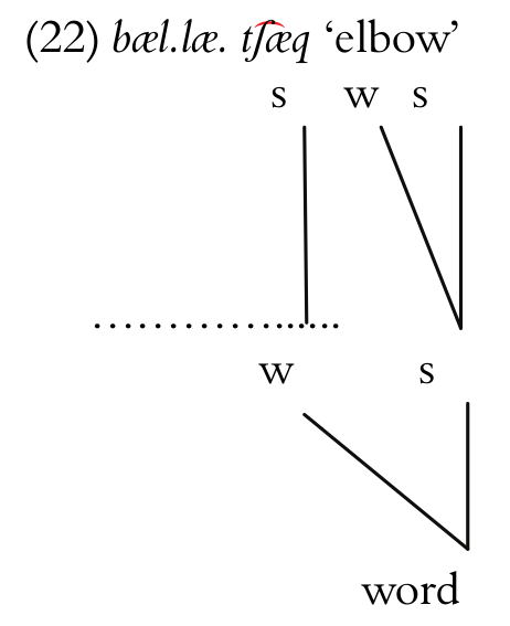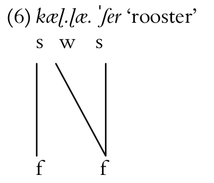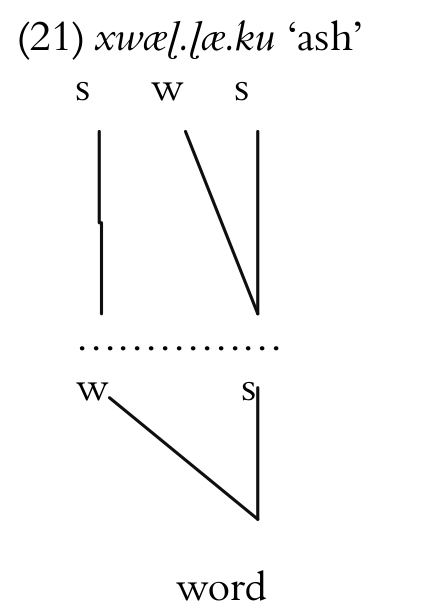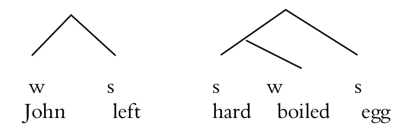 Originally introduced as a hierarchical theory of stress, this approach has been developed to cover the whole domain of syllable structure and phonological boundaries. The underlying metrical structure of words or phrases may be represented in the form of a metrical tree, whose nodes reflect the relative metrical strength between sister constituents, as in the following examples (w = weak, s= strong) Cristal, 2003: