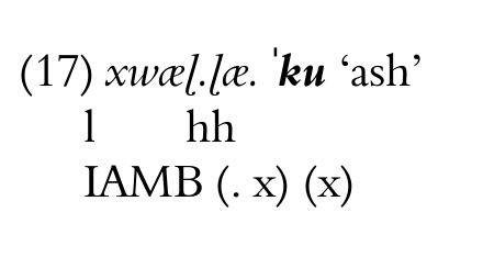 Feet are classified as ‘left-headed’ (the leftmost rhyme is stressed) or ‘right-headed’ (the rightmost rhyme is stressed) (Crystal, 2003). As far as Ilami Kurdish is taken into consideration, it is the rightmost syllable which plays the head role in the feet. So as a quantity-sensitive variety, Ilami feet could be either (x) or (.x) accordingly, 17 e 18.