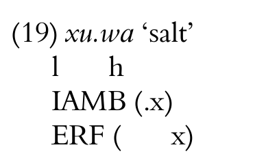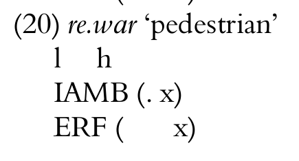 Respecting Ilami examples, it seems that in Ilami words the head (=strong foot) tends to be right-bounded. Should we take the following examples into account, we figure out that the strong foot is always right-bounded. For this reason, ERF (end rule final) places the x, indicating the main stress, at the right edge of the word, 19 e 20.