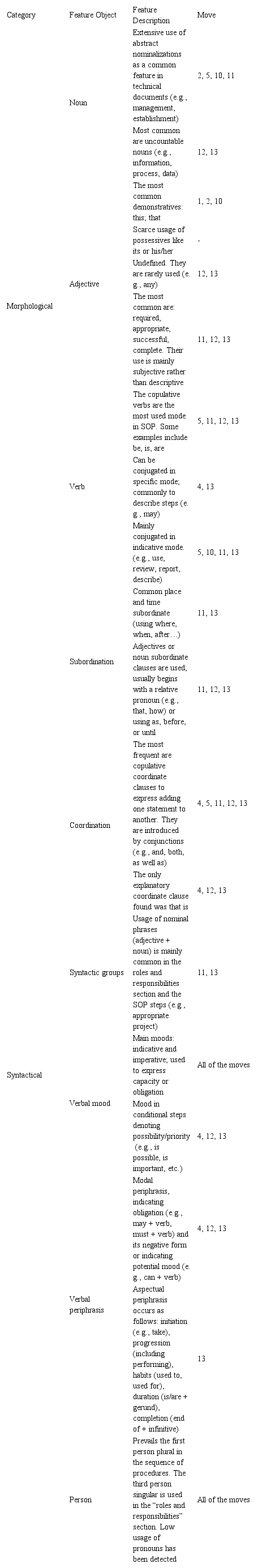 v. Morpho-syntactic tagging. This analysis aimed to identify the morpho-syntactic categories and features that surrounded each rhetorical unit. We described the features for such categories based on feature object, i.e., noun, adjective, syntactic clause, verb, subordination, coordination, verbal mood, verbal periphrasis, and person. The feature description is presented with the included move in Table 1 and functional features in Table 2.