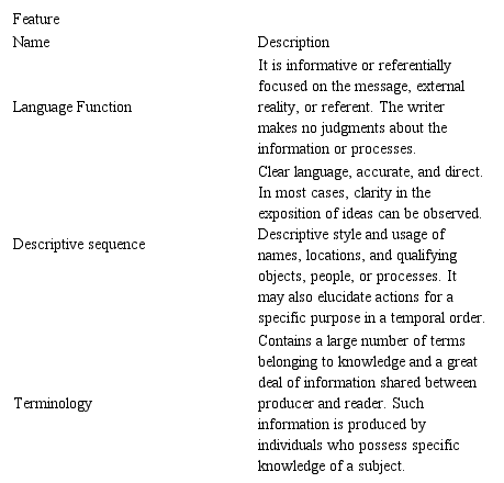 iv. Identification of linguistic features by rhetorical unit. We identified several variables, including word frequency that was based on mutual information, parameters of probable co-occurrence among words, recurrent lexical items in given stretches of text, keywords, and word frequency among others. We further used computational tools to identify prototypical lexical-grammatical features from the corpus sample (Table 1). According to Biber, Conrad, and Cortes (2004) and Venegas (2010), some of these features are essential to current writing in specialized organizational fields.