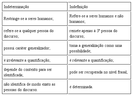 Baseando-se em Milanez (1982), Carvalho (2010) aponta alguns aspectos que servem para diferenciar a indeterminação da indefinição. A indeterminação restringe-se a seres humanos; refere-se a qualquer pessoa do discurso, ainda que sua marcação seja a uma das três pessoas do discurso; possui um caráter generalizador como uma de suas condições primárias; considera a quantificação como irrelevante; depende do contexto para ser interpretada e não identifica de modo exato as pessoas do discurso. Contrariamente à indeterminação, a indefinição refere-se a seres humanos e não humanos; não remete a outras pessoas do discurso, apenas à 3ª pessoa; toma a generalização como uma possibilidade; considera a quantificação como relevante; pode ser recuperada no nível frasal e é determinada, visto que uma das pessoas do discurso pode ser recuperada. No Quadro 1, apresenta-se um quadro com um resumo das propriedades da indeterminação e da indefinição: