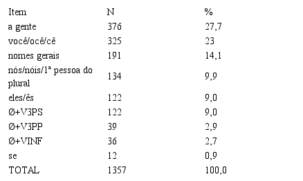 Na análise geral do corpus de dados de Bambuí, foram identificadas 1357 ocorrências distribuídas entre as formas de indeterminação. A variante ‘a gente’ foi a forma mais frequente, seguida de ‘você/ocê/cê’ e, em terceiro lugar, os nomes gerais, tal como mostra a Tabela 1.