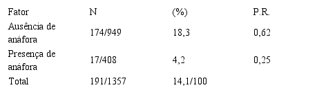 De acordo com a metodologia apresentada, em que se explica a variável linguística ‘presença ou ausência de anáfora’, selecionaram-se três maneiras de se classificar os itens no corpus para este grupo: a) retomada anafórica com o mesmo núcleo; b) ausência de anáfora; c) retomada anafórica com outro elemento. Entretanto, quando os dados foram rodados no software Goldvarb X, houve um knockout nessa variável e, dessa forma, reagrupou-se a variável ‘retomada anafórica com o mesmo núcleo’ com ‘retomada anafórica com outro elemento’. Tendo isso em vista, optou-se pelo reagrupamento, porque o número de dados do que foi denominado de ‘retomada anafórica com outro elemento’ era relativamente alto, não sendo, portanto, interessante para a pesquisa fazer uma exclusão desses resultados. Feita essa junção, obtêm-se os seguintes resultados (Tabela 2):