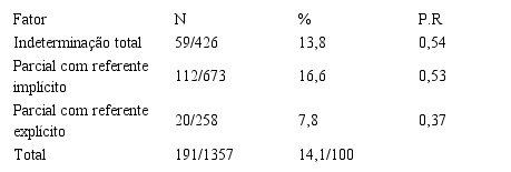 A segunda variável selecionada como favorecedora dos nomes gerais é o ‘grau de indeterminação’. De acordo com a metodologia apresentada, ‘a indeterminação parcial com referente explícito’ se dá quando existe alguma palavra, expressa pelo informante, que torna possível retomar de quem se está falando. A ‘indeterminação parcial com referente implícito’ ocorre, no entanto, quando se recupera de quem se está falando pelo contexto. A ‘total’, contrariamente às outras, não torna possível a recuperação. A Tabela 3 apresenta os resultados obtidos a partir do corpus: