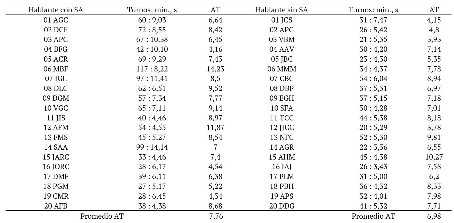 Como muestra la Tabla 1, tras la comparación de las 40 muestras de discurso oral procedentes de niños con y sin déficit pragmático, el valor promedio que se obtiene para la AT es 0,78 puntos superior en el grupo de hablantes con déficit pragmático. Mientras que a los sujetos sin déficit les corresponde un promedio de 6,98 turnos por minuto, en el caso de los diagnosticados con SA este valor asciende a 7,76.