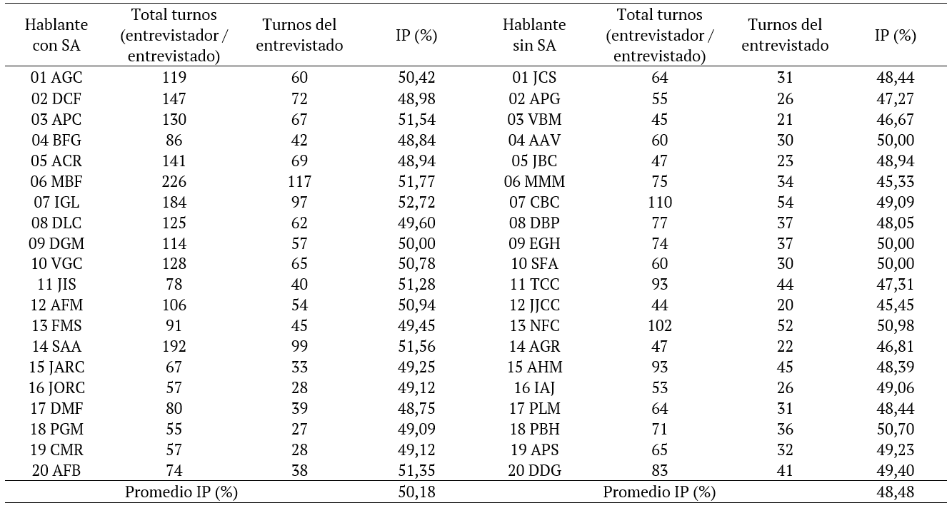 Se comprueba, por lo tanto, que existe una clara equiparación entre los valores relativos a la AT y al IP en los grupos de hablantes con y sin déficit pragmático. Del mismo modo, el análisis del IP revela valores equivalentes entre 1) entrevistador / entrevistado, y 2) entrevistado con déficit / entrevistado sin déficit. Así pues, no cabe hablar de tendencia al monopolio ni tampoco al laconismo en este caso.