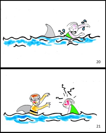 Para facilitar la recogida de las muestras orales de los sujetos con y sin SA, se diseñó un apoyo gráfico para el entrenamiento pragmático (AGEP) (Rodríguez Muñoz, 2013). El propósito principal de este instrumento fue motivar un discurso oral semiorientado a partir de viñetas agrupadas en ocho situaciones diferentes en las que se abordaban contenidos diversos (comprensión de inferencias y de estados anímicos ajenos, verbos mentalistas, superestructuras narrativas, humor, empatía, entre otros). Por lo tanto, la función de las imágenes fue la propia de un guion conversacional (sirva de ejemplo la Figura 1).