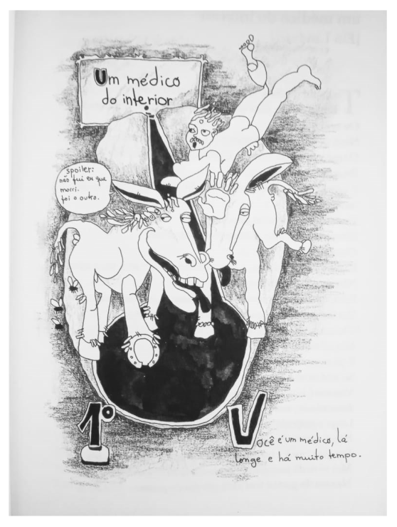 A irrupção que Vigna faz ao texto de Kafka como procedimento de reescrita é repetida nas imagens que ilustram cada um dos contos. No já citado Um médico do interior (Ein Landzart), a autora traz duas informações importantes, por escrito, antes mesmo do leitor virar a página de acesso ao conto, conforme podemos conferir na Figura 1.