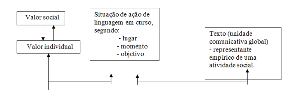 O ser humano não é um mero reprodutor do seu meio (um sujeito), mas sobretudo, um indivíduo que é um produto de seu meio sócio-semiótico-histórico. Com isso, o conjunto de pré-construídos sócio-históricos é reconstruído de forma diferente em função da personalidade de cada indivíduo. Na verdade, os indivíduos são tanto produtores quanto reprodutores do seu meio social, sendo esse processo alimentado por processos interativos vários, inclusive pelo próprio efeito da semiotização do psiquismo de cada indivíduo. É pelo ‘processo de abstração e de generalização que cada indivíduo tem a capacidade de abstrair-se dos determinismos e/ou constrangimentos de seu meio e da sua língua, de avaliá-los, aderindo a estes ou contestando-os’. É em função de toda essa dinâmica que os indivíduos constroem, por generalização, os seus ‘valores’, os seus conhecimentos. Assim, podemos afirmar que todo indivíduo é construído, de um lado, por determinismos sociais e, do outro, por uma tentativa de ultrapassar (atualizando constantemente) estes últimos. Sendo assim, pode-se considerar a existência de valores sociais de natureza mais universal, e outros mais individuais, relacionados às necessidades específicas de cada indivíduo, em função do contexto sócio-histórico em que naquele momento ele se encontra. Em função de uma determinada ‘ação de linguagem’, contextualmente situada (num lugar e momento específicos) e com uma finalidade clara, o agente produtor produz textos. Estes, por sua vez, vão traduzir, a partir de seus elementos plurissemióticos, tanto valores socialmente indexados quanto valores individuais. Inclusive, estes últimos são reproduzidos e atualizados constantemente, como tentamos reproduzir no esquema a seguir (Figura 1):