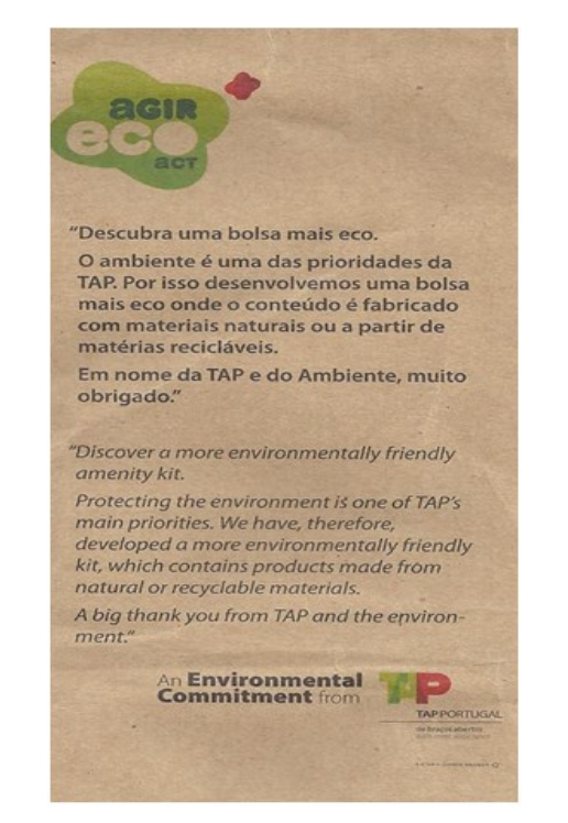 O ambiente é uma das prioridades da TAP. Por isso desenvolvemos uma bolsa mais eco onde o conteúdo é fabricado com matérias naturais ou a partir de matérias recicláveis.