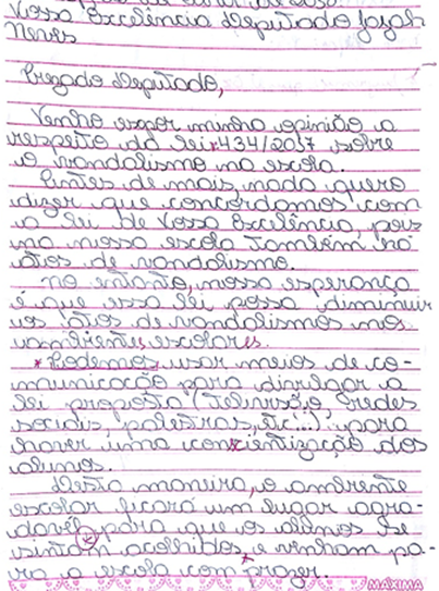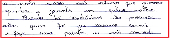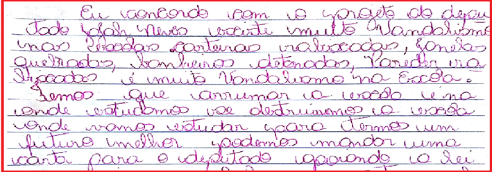 Na produção do texto 44% dos alunos escreveram que seria interessante comunicar-se com o deputado que criou o projeto de lei para apoiá-lo, sugerir acréscimos, modificar a punição para uma forma mais severa, como mostra o fragmento na Figura 1.