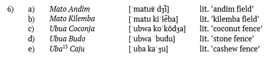 In (6a,b), mato means ‘field’ in Santome (Araujo & Hagemeijer, 2013, s. v.), a generic item found in toponymic syntagmata on São Tomé Island but not on Príncipe Island, whose form in Lung’Ie is umatu (Agostinho & Araujo, 2021). These examples show a nominal construction of possession common to Santome and Lung’Ie. The possession relationship between two names is obtained by concatenating the postponed possessor item to the possessed item. In (6c,e), conversely, the generic term is ubua/uba in São Tomé Island and uba in Príncipe Island, both meaning ‘fence.’ As in the case of poto, it refers to an element with a cultural nature to refer in a generic way to a geographical area. In this sense, it is possible to construct toponymic syntagmata in autochthonous languages. The generic item must be a common noun that describes a toponym characteristic features (cf. Dick, 1992).