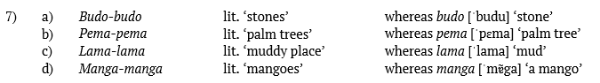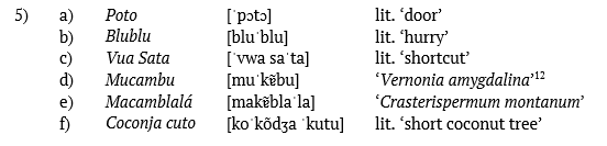 Reduplication is also adopted as a recurring process of creating Santomean toponyms in autochthonous languages (7a) and Portuguese (7b–d). In the latter, lexical items come from Portuguese, noun reduplication is a grammatical feature of autochthonous languages, while verb reduplication is found in Portuguese (Araujo, 2002).