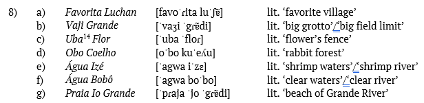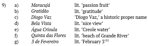 The example (8a) has an ambiguous interpretation, as the common noun luchan lit. ‘village, non-urbanized area’ can be a generic item, featuring the toponym favorite, ‘favorite,’ or toponymized together with favorita, demarcating a toponym in its entirety. This issue is beyond the scope of this study and will not be addressed. However, the hybrid formation of Favorita Luchan, which involves a common name in Santome, luchan, and a name from Portuguese, favorita, is emphasized.