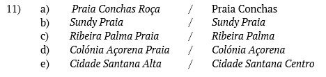 In (11a–d), the generic elements praia ‘beach,’ ribeira ‘stream,’ colónia ‘colony,’ cidade ‘town,’ alta ‘highlands,’ centro ‘town center,’ and roça ‘farm,’ when postponed to a specific term, qualify the previous term and constitute a toponymic unit, as in (11e). Therefore, they divest themselves of the generic character, which can be performed optionally by another generic element. The disambiguation of toponyms can also occur by adjectivation of the toponym (12a, b) or even by its numbering (12c,d).