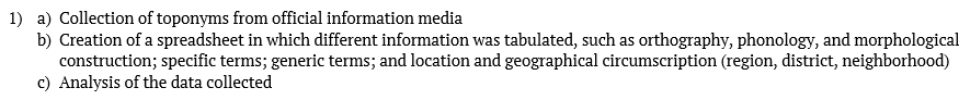 Toponymy research can be (i) qualitative (intensive) or (ii) quantitative (extensive) (Tent, 2015). While the former corresponds to a model centralized mainly on etymology, possible meanings, and the etyma of toponyms, the latter is a broad approach focusing on structural, semantic, and sociohistorical patterns. This study analyzed the official toponymy of São Tomé Island following the second approach. An extensive analysis to provide a general and preliminary description of Santomean toponymy compared with the country’s multilingual scenario was performed. Since this was a pioneering study, the methodological and taxonomic approach adopted was based on the available literature on Brazilian and Portuguese varieties of Portuguese[3].