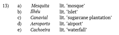 A second element in the compound suggests a double interpretation for the toponyms in (12). From one side, it can be a stable compound, consisting of two lexical items, such as in Praia Conchas (11a) and Ribeira Palma (11c). On the other hand, it can also correspond to an item with an added generic part to undo any ambiguity with other toponyms. Nevertheless, these generic parts qualify a specific element, creating a new toponym. Generic toponymization also occurs from isolated elements (13). As discussed in this section, ilhéu ‘islet’ can occur with some toponyms forming a generic syntagma. However, in (13a), ilhéu is a toponym and names a neighborhood on its own. Mesquita, Canavial and Cachoeira exemplify cases in which a generic element is adopted as a toponym too.