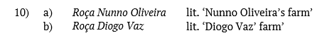 Analysis of Portuguese toponymy shows that toponyms can consist of simple names (9a,b), compound names (9c,d), and commemorative dates (9g). It can be formed by a toponymic syntagma comprising a generic and a specific element (9e,f).