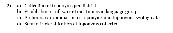 Toponyms are related to several physical and anthropocultural aspects of a given linguistic community. Toponyms are linguistic markers of time and place, referring to past eras in which the act of naming took place, and so provide clues about the historical, social, and cultural facts of a community (see Terhi & Jan-Ola, 2007). Thus, toponymic studies also consider extralinguistic resources (Carvalhinhos, 2009). The transdisciplinary nature of toponymy studies can contribute to the understanding of different linguistic strata that structure the vernacular expression of a determined speech community within a circumscribed territory. Therefore, it may reflect synchronous and/or diachronic multilingual conjunctures that characterize the observed area (Carvalhinhos, 1998;Dick, 1992; Nash, 2015; Pedersen, 2017).