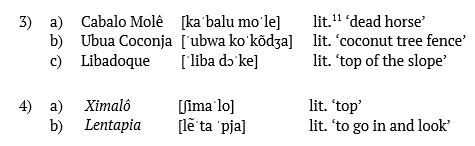 Toponyms in autochthonous languages can be attributed mainly to Santome, although there are toponyms in Lung’Ie in the autonomous region of Príncipe. In (3) and (4), some toponyms formed with lexical items from Santome and Lung’Ie, respectively, are listed[9],[10].