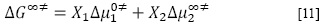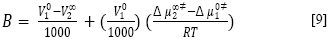 Donde X1 y X2 son las fracciones molares del solvente y soluto, respectivamente. Δµ∞‡2 como se define en la ecuación anterior, incluye cualquier cambio en la energía libre de activación de las moléculas de disolvente causados por la presencia del soluto, así como la contribución del movimiento propia del soluto (19). De acuerdo con la teoría de Feakins (20), el coeficiente B de viscosidad está relacionado con Δµ∞‡2 por la ecuación [9].
