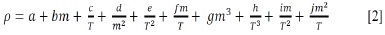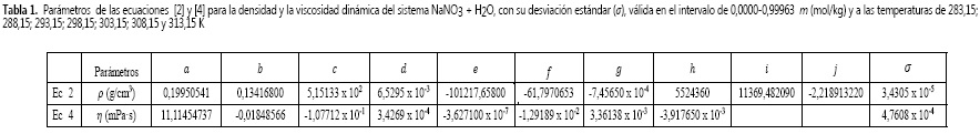 Donde p es la densidad de la solución, ra (mol/kg) es la molalidad del NaNO3 en la mezcla NaNO3 + H2O, T es la temperatura absoluta, a es la desviación estándar y las letras minúsculas desde a hasta j son parámetros ajustables. Los resultados de este ajuste se muestran en la Tabla 1, estos permiten obtener densidades de la mezcla NaNO3 + H2O, con la desviación estándar (σ) especificada en dicha tabla.