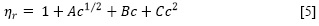 A partir de las viscosidades dinámicas de la solución obtenidas con la ecuación [4], se determinó la viscosidad relativa (ηr) como la razón de la viscosidad dinámica de la solución respecto a la del solvente puro (η0). Estas viscosidades, a su vez, se ajustaron usando un procedimiento de mínimos cuadrados con la ecuación [5] de Jones-Dole para soluciones electrolíticas (11).