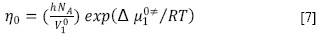 Donde h es la constante de Planck, NA es el número de Avogadro, η0 es la viscosidad del solvente en Pa s, V10 es el volumen molar del solvente puro en m3/mol, R es la constante de los gases y Δµ10‡ es la contribución por mol del solvente de la energía libre de activación del flujo viscoso de la solución.