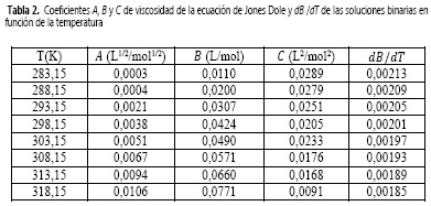 Donde c es la molaridad (mol/L), A, también llamado coeficiente de Falkenhagen, es una constante positiva que mide las interacciones de largo alcance ion-ion (fuerzas de Coulomb), B es una constante que tiene en cuenta la interacción ion-solvente (12) y el coeficiente de C incluye todas las interacciones estructurales soluto-solvente y soluto-soluto que no se toman en cuenta en los términos Ac1/2 y Be (11). Las constantes A, B y C son parámetros de ajustables y T es la temperatura en Kelvin. Los resultados de este ajuste se muestran en la Tabla 2.