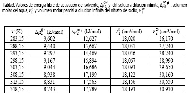 Los valores de los coeficientes B y C resultan ser mucho mayores que el coeficiente A, lo que indica un claro predominio de las interacciones ion-solvente. Adicionalmente los valores de dB/dT son positivos a lo largo de todas las isotermas y composiciones de NaN03, hecho que indica que el nitrato de sodio actúa como un soluto formador de la estructura del agua.