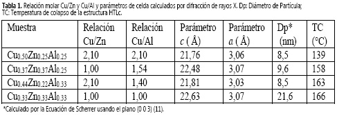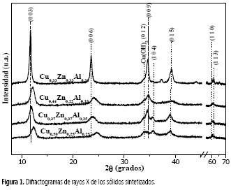 Las relaciones molares y los códigos usados para identificar los sólidos sintetizados son mostrados en la Tabla 1. Las relaciones molares obtenidas a trav s espectrometria de absorción atómica muestran un alto grado de correspondencia entre los valores teóricos (Cu/Zn = 2,o o i,o; Cu/Al = i,5 o i,33) y los obtenidos experimentalmente, lo cual comprueba la efectividad del método de síntesis.