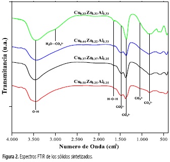 Los espectros FTIR de los sólidos muestran varias bandas que son características de las estructuras HTLc que contienen el anión carbonato (Figura 2). Se observa que, en los sólidos con las cantidades más altas de cobre la banda originada por el estiramiento O-H (M-OH, H-OH) se desplaza ligeramente hacia valores más bajos de número de onda. Esto se debe a que la densidad electrónica del grupo OH se orienta hacia el centro metálico de cobre por su baja densidad electrónica en el orbital 4s (3d10 4s1), lo que conduce a la disminución de la frecuencia de vibración O-H en relación a otros elementos de la primera serie de transición (16).