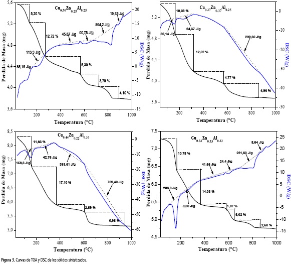 En todos los sólidos se evidenciaron varios procesos durante el calentamiento que están relacionados con la salida de agua fisisorbida en la superficie de los sólidos y la que está presente entre las láminas de la estructura. Seguido a este proceso, los aniones carbonato y grupos hidróxido se descompusieron y se formaron óxidos de cobre y zinc, a temperaturas inferiores a 350 °C, y óxidos de aluminio entre 400 y 500 °C.