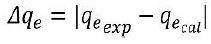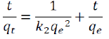[2]Donde 𝑞𝑒 y 𝑞𝑡 es la cantidad de AM adsorbido (mg/g) en el equilibrio y en el tiempo t (min), respectivamente, y 𝑘2 es la constante de velocidad de pseudo segundo orden (g/mg·min). Basados en los datos experimentales de qt y t, la capacidad de adsorción en el equilibrio (𝑞𝑒) y la constante de velocidad de pseudo segundo orden (𝑘2) pueden ser determinadas a partir de un gráfico de t/qt Vs t usando la pendiente y el intercepto, respectivamente.