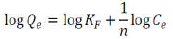[5]Donde 𝐾F es la constante de disociación de Freundlich, la cual presenta altos valores cuando el adsorbato tiene mayor afinidad hacia los sitios de adsorción o enlace y la constante 𝑛 es proporcional a la intensidad de reacción. 𝐾F y 𝑛 se pueden determinar a partir del intercepto y pendiente de la relación lineal de log 𝑄𝑒 Vs log 𝐶𝑒, respectivamente.