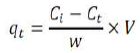 [7]Donde 𝑞𝑡 es la capacidad de adsorción del adsorbente (mg/g), 𝐶i y 𝐶𝑡 son las concentraciones iniciales y en el tiempo t de AM en la solución (mg/L), V es el volumen de la solución (L) y 𝑤 es la masa del adsorbente (g). Mediante este proceso también es posible determinar el tiempo óptimo de contacto (12).