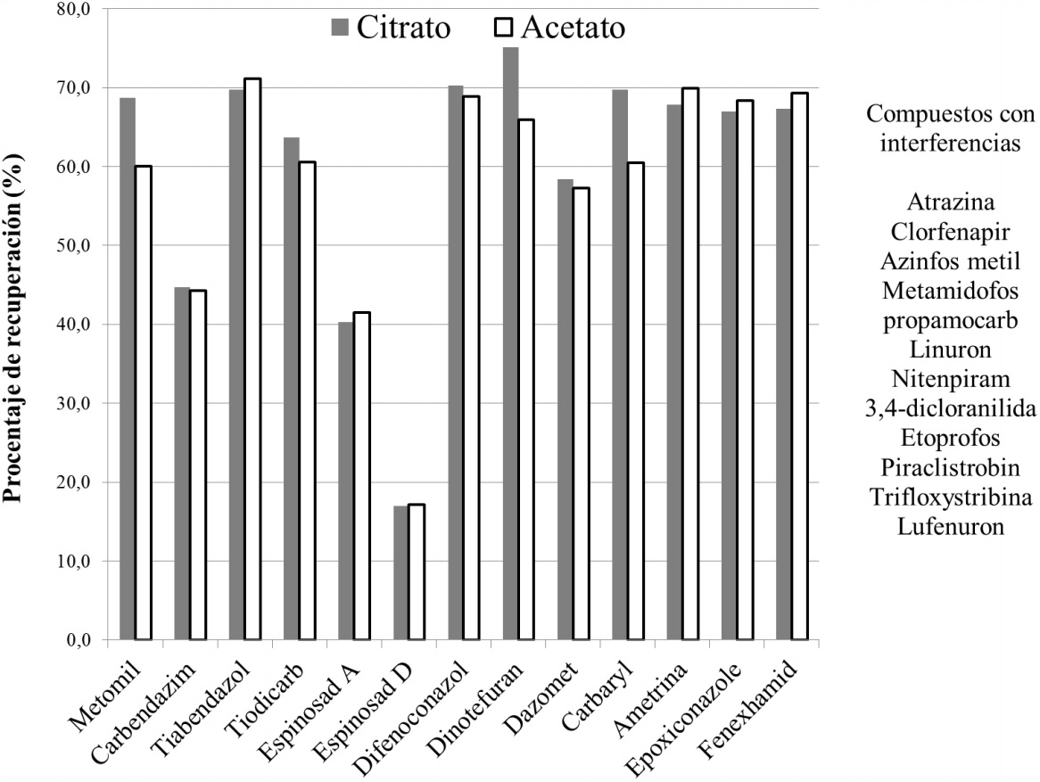 Finalmente, los compuestos que presentaron porcentajes de recuperación menores al 70% a pH 5 correspondieron a los isómeros del espinosad y carbendazim. Para el caso de los primeros no fue posible encontrar los valores de pKa, por lo cual se cree que estos compuestos sufren algún tipo de hidrólisis o descomposición que impide una adecuada extracción. Para el caso del carbendazim, el pKa es 4,48, por tanto, es posible que al encontrarse la molécula ionizada la extracción por parte de un solvente orgánico no sea eficiente (19).