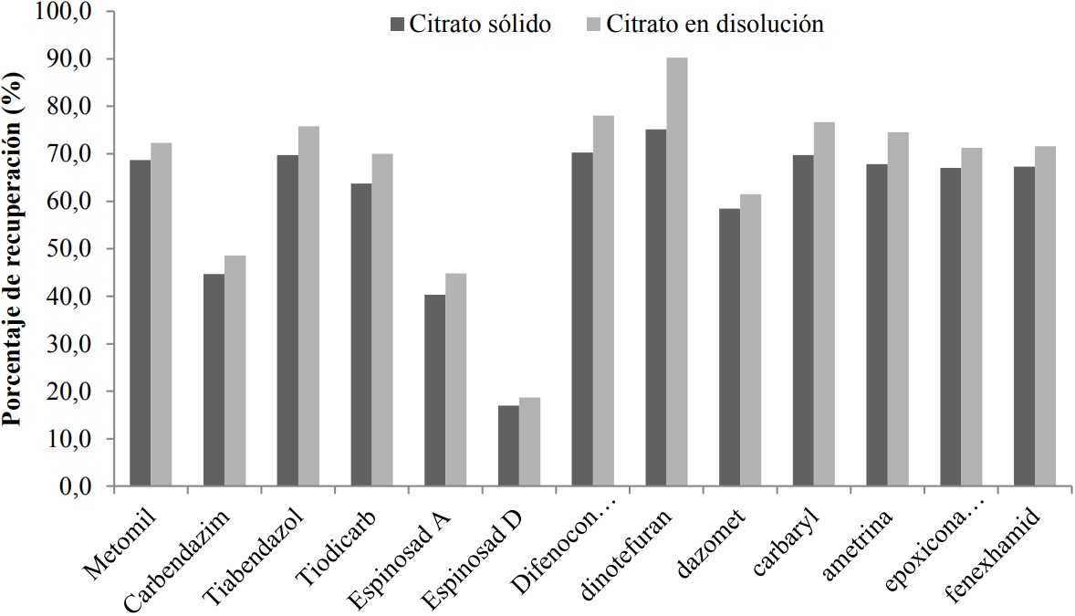 La Figura 2 muestra que, para 8 de los 12 compuestos que no se recuperaron con el método tradicional, se obtuvieron porcentajes superiores al 70%, lo cual indica que el sesgo del método disminuyó. Sin embargo, de acuerdo a estos resultados, carbendazim, tiodicarb, dazomet y espinosad (A y D) siguen presentando porcentajes de recuperación bajos.