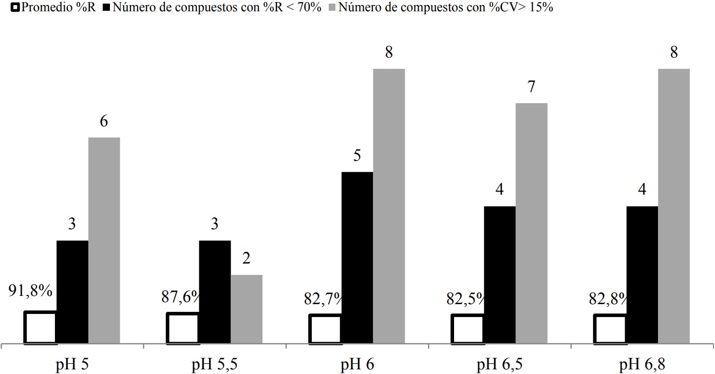 La Figura 3 muestra que al comparar los tres valores más altos de pH, se encuentra que estos no varían de manera considerable, igual que el número de compuestos con recuperaciones bajas o dispersiones altas. Sin embargo, para los dos valores de pH más bajos se observa que, tanto la recuperación como la precisión del método, es incrementada, pues tienen solo 6 y 7 compuestos con %CV menores al 15%; para el valor de pH más bajo se tienen solo 3 compuestos con recuperaciones inferiores al 70%.