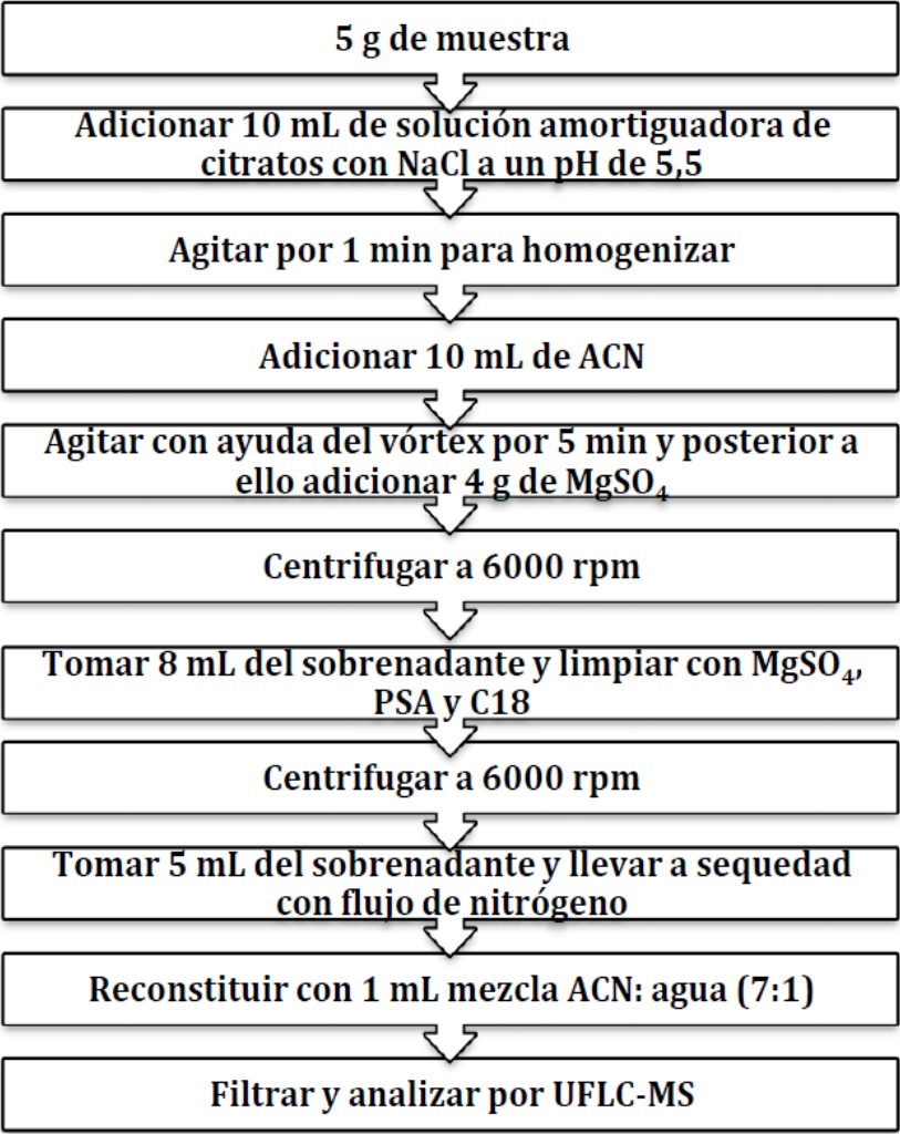 El acetonitrilo es un solvente conocido por no extraer demasiados compuestos de naturaleza lipídica así como compuestos de elevada polaridad como el caso de los azúcares. Sin embargo, el aumento de la fuerza iónica en el sistema de extracción a través del MgSO4 y del NaCl, inducen a que se extraigan este tipo de compuestos junto con los analitos. En este sentido, se considera que el empleo de C18 reduce notablemente la cantidad de interferentes, debido a la adsorción de este tipo de compuestos que tienen baja solubilidad en acetonitrilo. Adicionalmente, es posible que exista un efecto sinérgico al hacer uso de PSA y C18, pues las señales producidas por los interferentes químicos se redujeron a lo largo de todo el cromatograma. Finalmente, la Figura 4 describe el esquema general del método desarrollado.