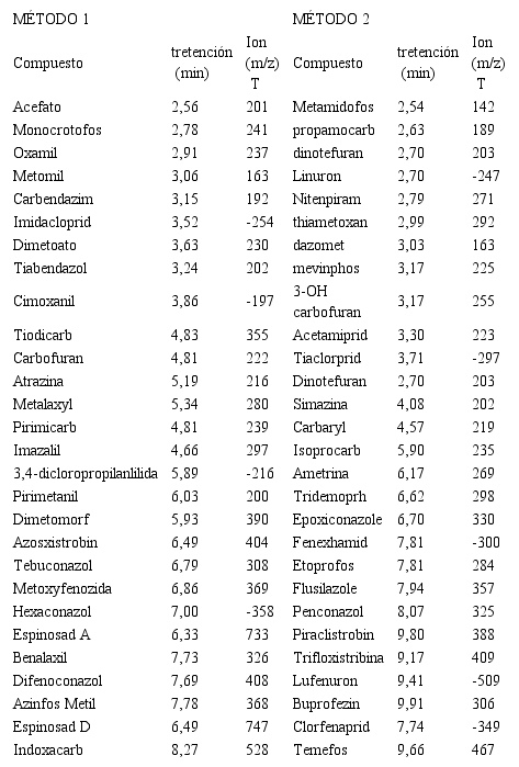 Los análisis fueron llevados de manera simultánea en modo positivo y negativo, el voltaje aplicado en el capilar correspondió a 4500 V y -4500 V respectivamente. Todos los análisis fueron realizados en modo SIM. La Tabla 1 muestra los iones seleccionados para la cuantificación y el tiempo de retención de cada compuesto: las tres primeras columnas muestran las condiciones para el método de adquisición 1, mientras que las tres últimas columnas son para el método de adquisición 2. Estos compuestos fueron seleccionados acorde con la legislación nacional e internacional (23), el nivel de afectación a las abejas, su uso en Colombia, sensibilidad en el instrumento y la disponibilidad del material de referencia para la calibración del instrumento.