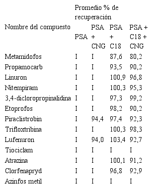 Por otra parte, se encuentra que el uso de CNG no contribuye de manera significativa a la mejora de la selectividad del método, pues los resultados indican que permite la reducción de interferentes para sólo tres compuestos. Asimismo, al observar el último sistema que incluye C18 y PSA, se encuentra que el carbón no aporta de manera significativa, al contrario, para algunos compuestos los porcentajes de recuperación son inferiores, lo cual se debe posiblemente a la adsorción de los analitos generada por la mayor área superficial que se tiene.